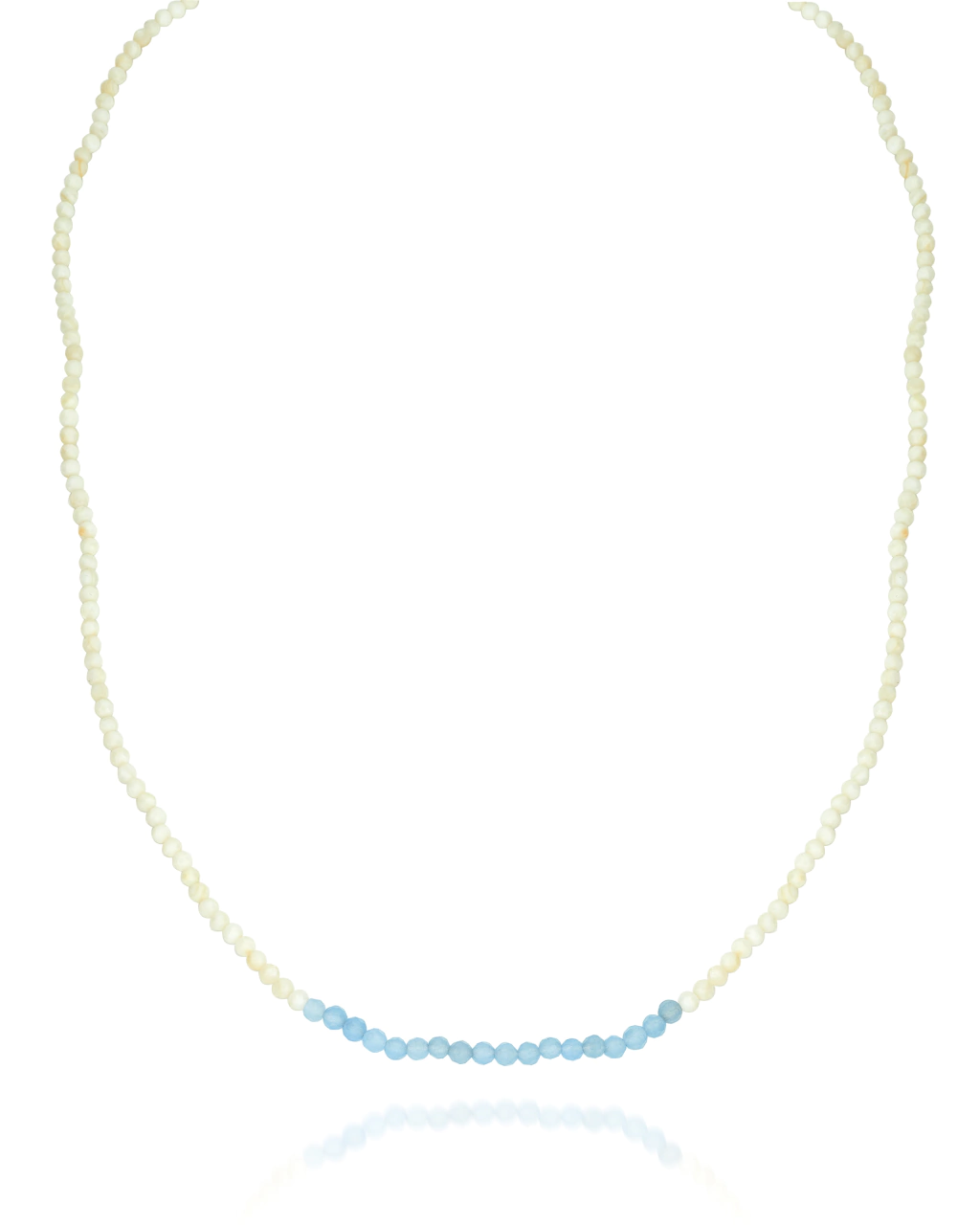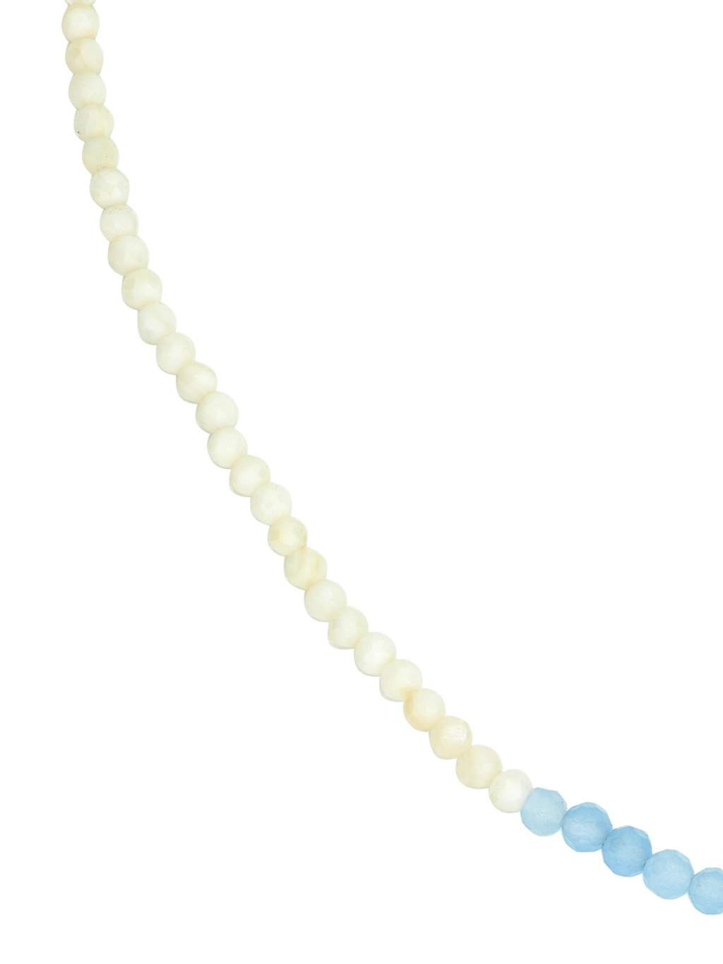 Produzido em fio de Pedra Natural Madrepérola facetada 3 mm e Pedra Jade Azul 4 mm.