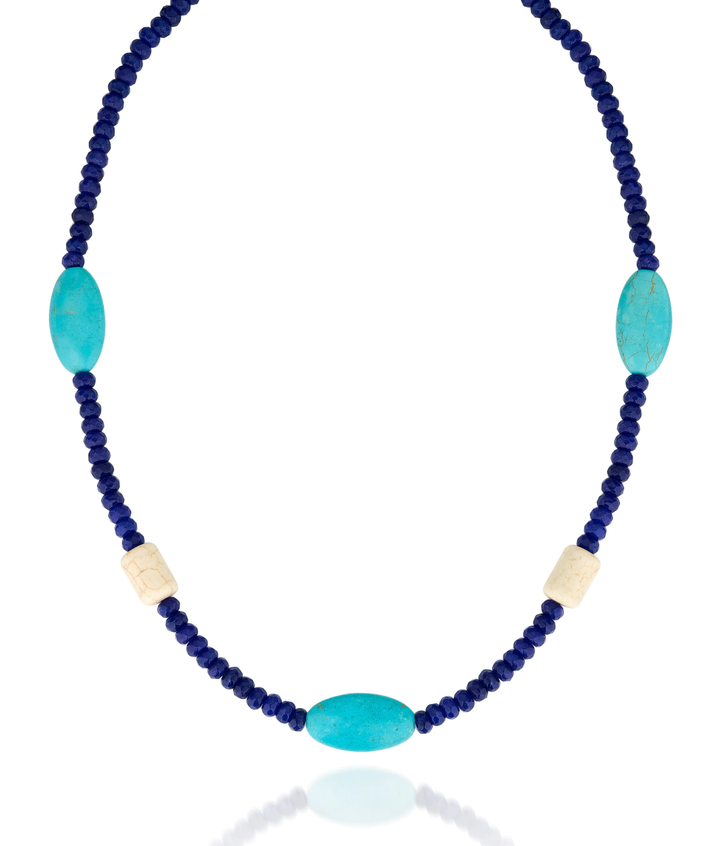 Produzido em Pedras Naturais Jade azul, Turquesa e Howlita, com fecho em Prata 925.
