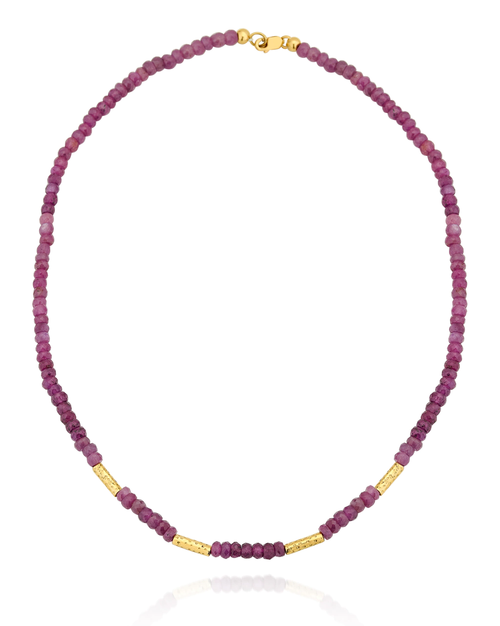 Produzido em Pedras Natuais Rubi degradê 4,3 mm com canutilhos produzidos de forma artesanal em Ouro 18k.