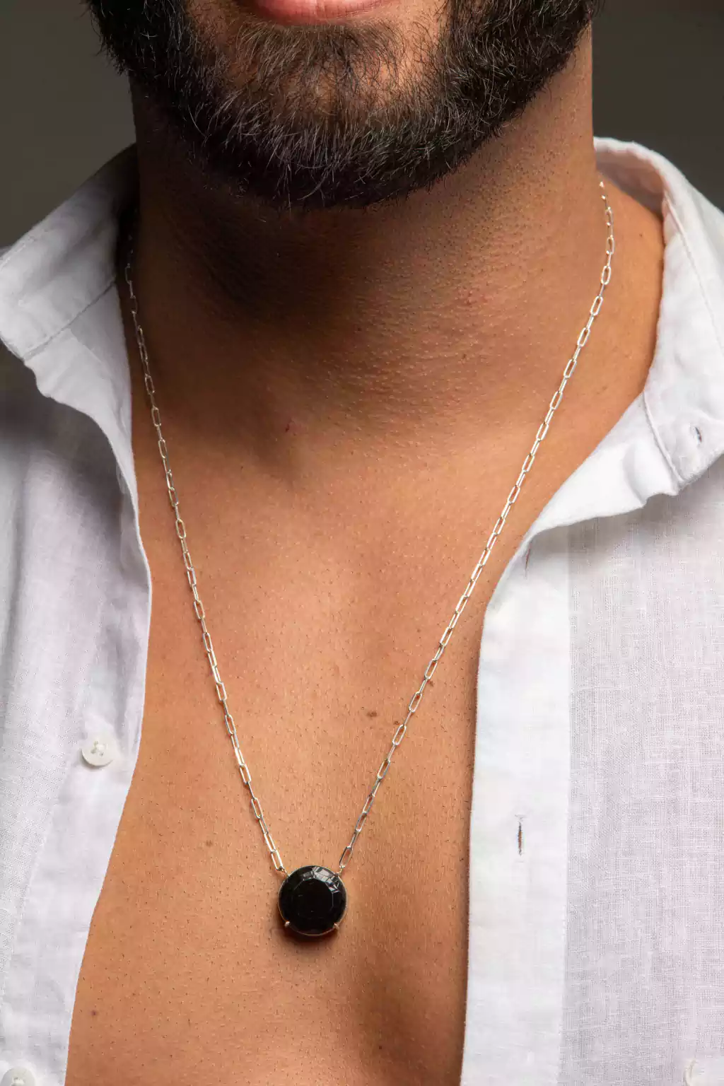 Produzido com Corrente Elo Retangular em Prata 925 e Pedra Natural Ônix formato redondo.