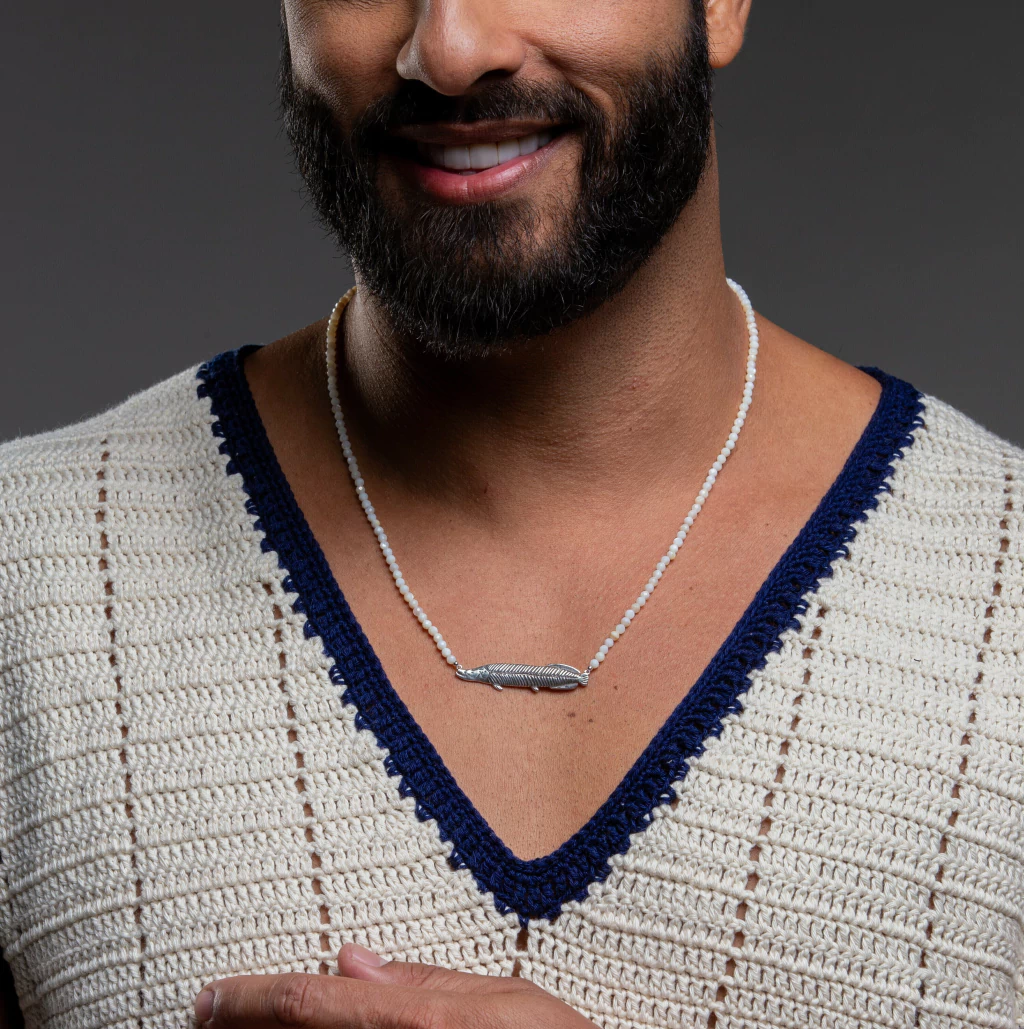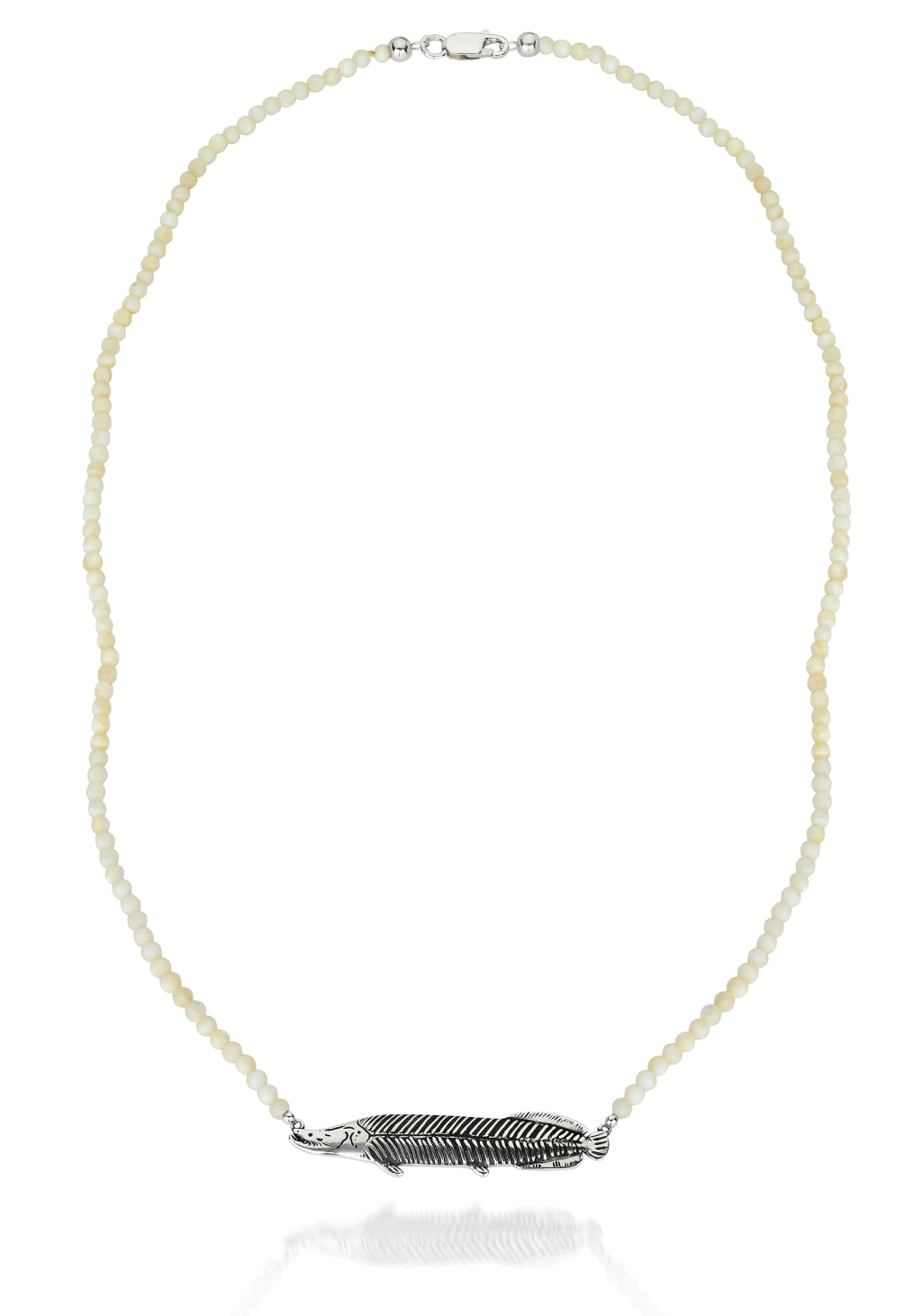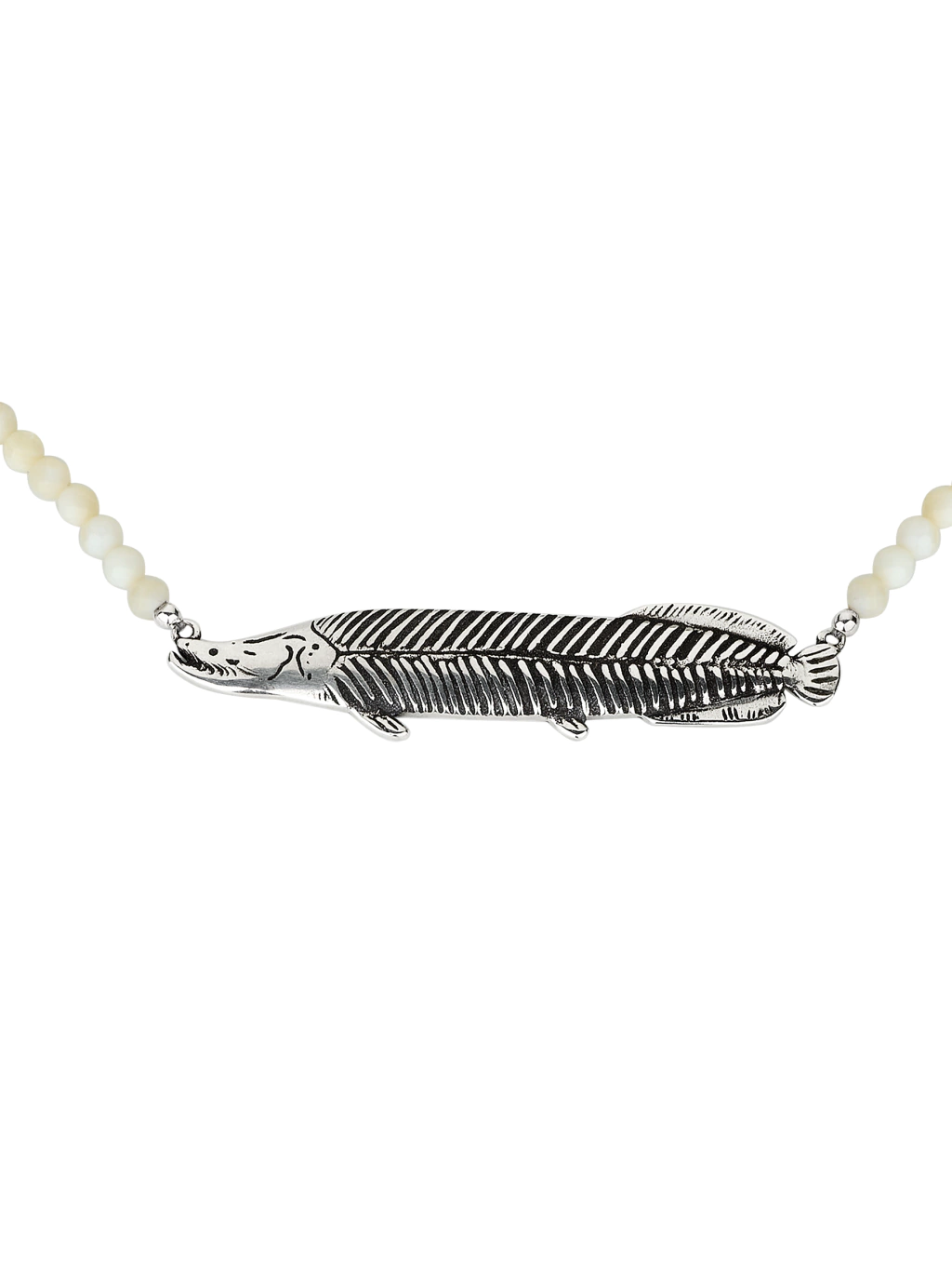 Produzido em Pedra Madrepérola facetada 4mm e Peixe Pirarucu em Prata 925.